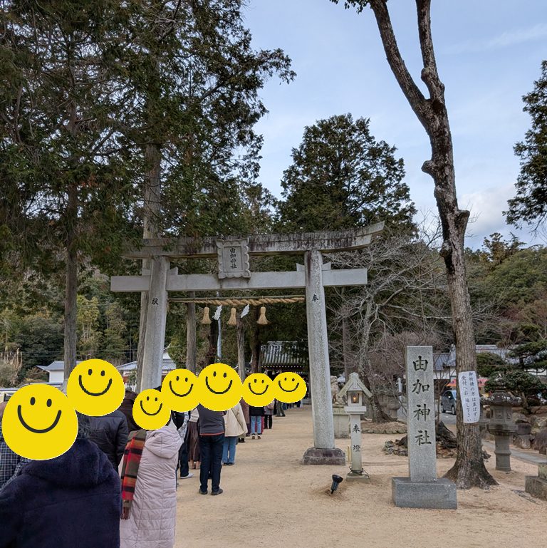 お正月の由加神社はにぎわっていて、お参りするのに鳥居の辺りまで並ぶんです。