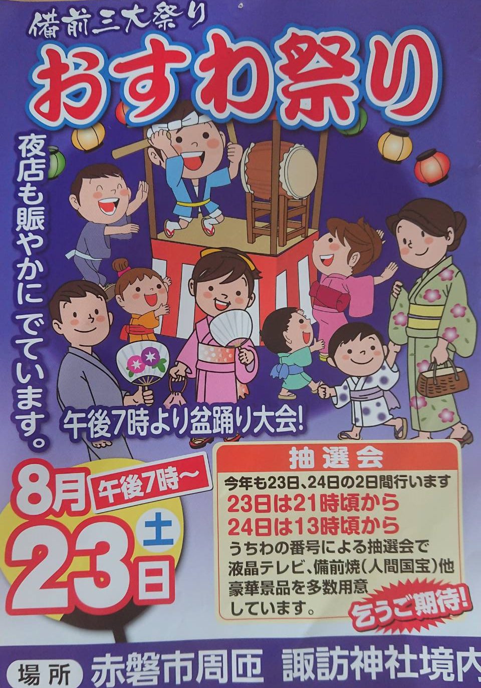 8月23日は午後7時~・24日は午前10時30分~地元のお祭り「おすわ祭り」がありました。諏訪神社境内で盆踊りと夜店が出ていました。24日は、地元の中学校吹奏楽部の演奏や、小学生のよさこい踊りなど、傘踊りやうらじゃなど色々ありました。