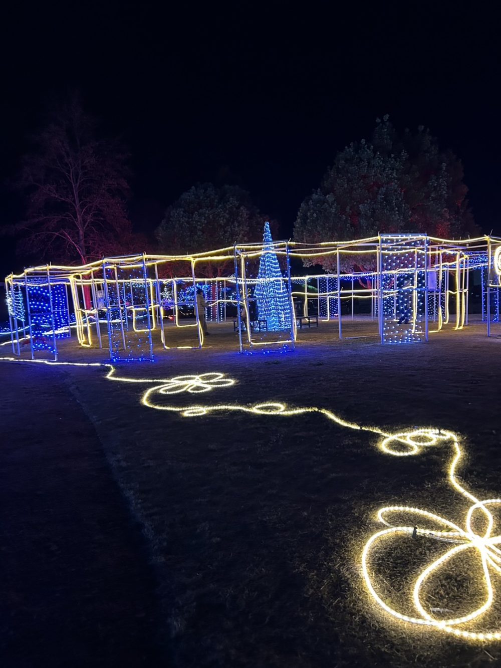 中に入ると広場にアヒルがいたり、大阪万博の大屋根リングを模した造りにしたものや、トナカイがきれいに点灯していました。
