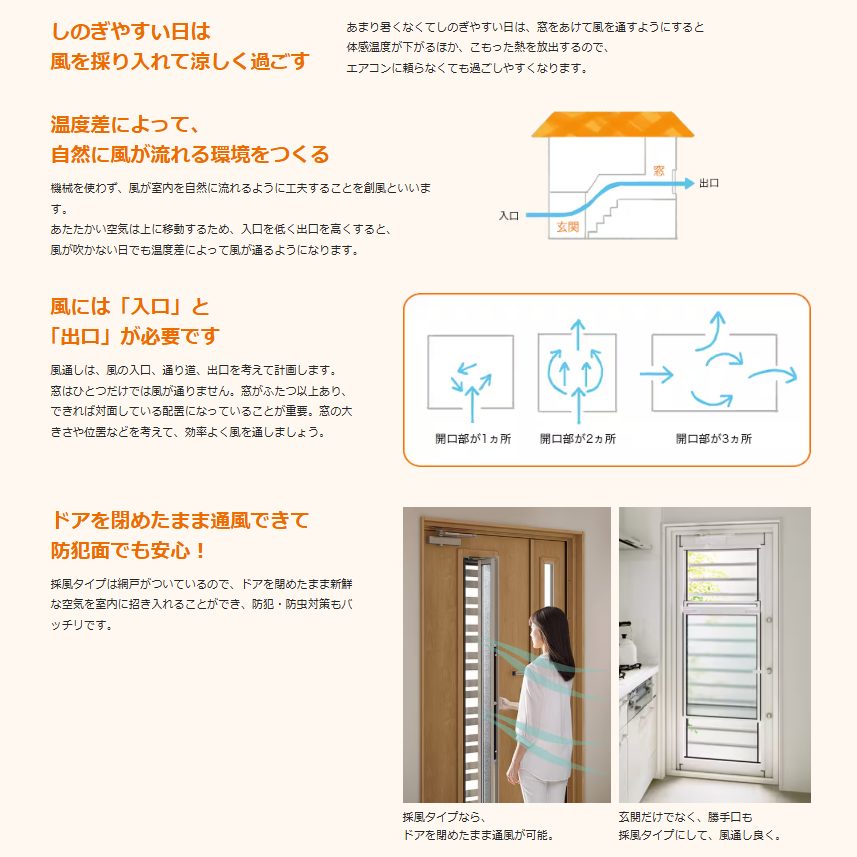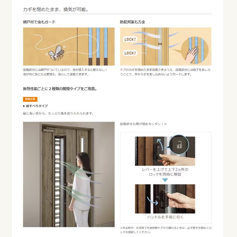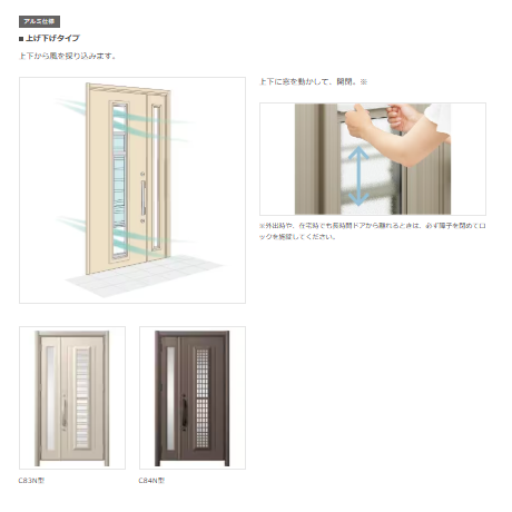 採風のタイプも縦すべりタイプと、上げ下げタイプなど選べれるので、お家にあったドアを選べます。