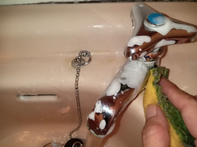 時間をおいたらスポンジで蛇口を軽くこすって下さい。