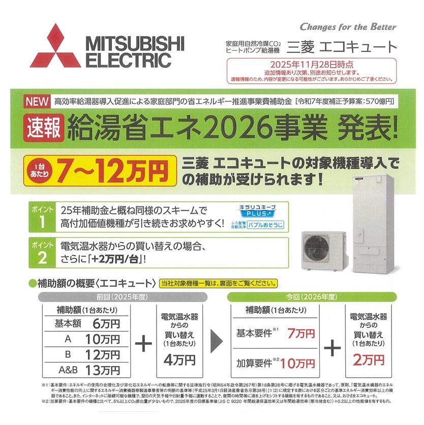 今年度も、エコキュートなどの高効率給湯器への交換をサポートする補助金制度『給湯省エネ2026』が