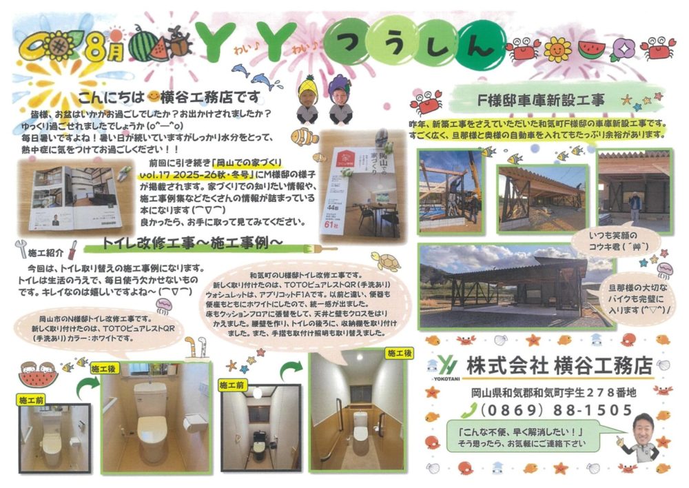 YY通信8月号 こんにちは 横谷工務店です😊 YY通信の8月号が完成しました! 今月号は、トイレの施工事例2例、F様邸車庫新設工事 を掲載しております😆 詳しい内容はHPをチェックして下さい お盆を過ぎてもまだまだ暑い日が続いています。 どうぞ皆さまお身体ご自愛ください( ⁎ᵕᴗᵕ⁎ ) 🏠和気町・赤磐市・美作市で、新築・リフォームをお考えの方横谷工務店にぜひご相談ください! 📱横谷工務店インスタグラム・YouTubeやっています!良かったら、フォロー、いいねなど、よろしくお願いします☆ Post Share Hatena LINE RSS feedly Pin it note 夏季休業のお知らせ 前の記事 YY通信9月号 次の記事